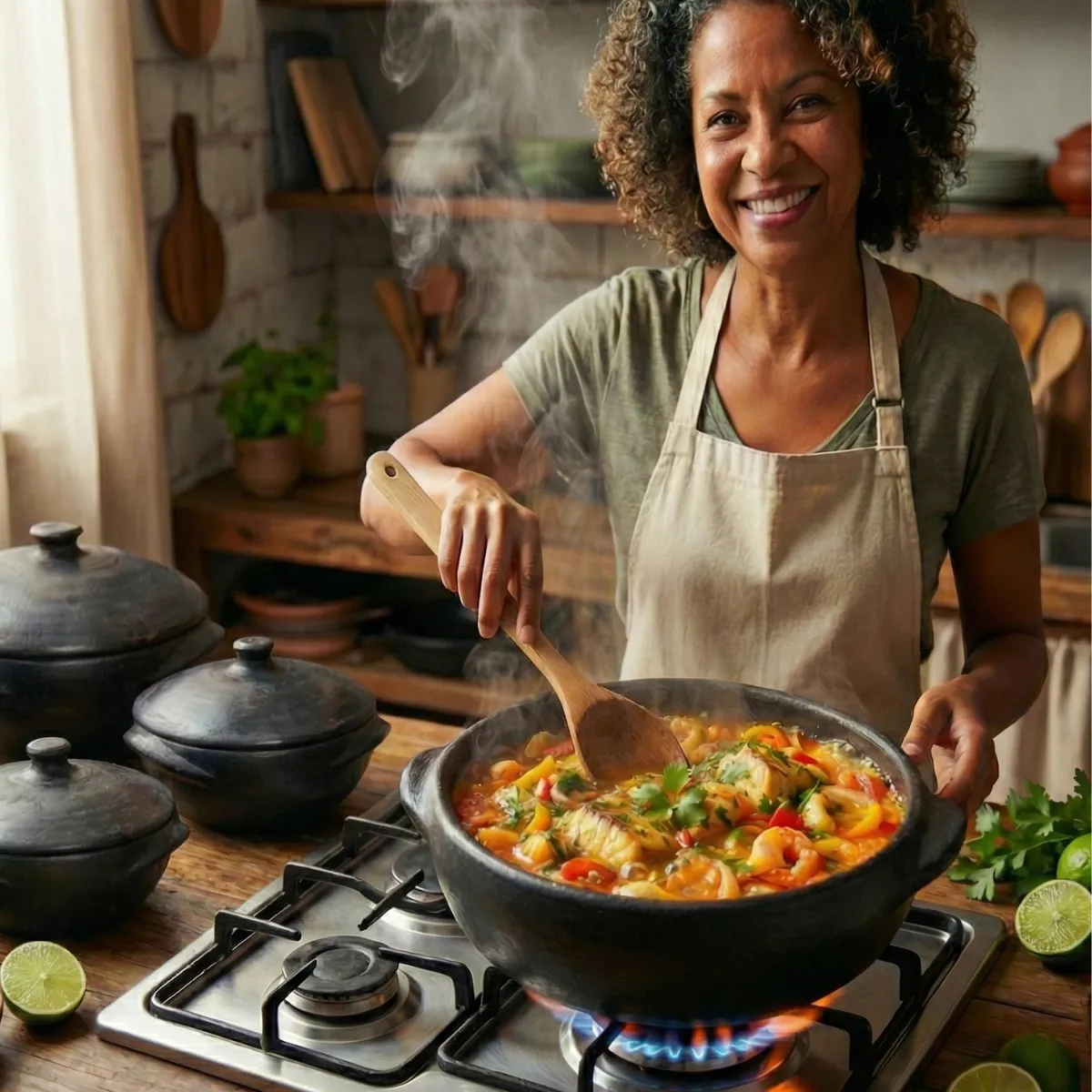 Prepare a verdadeira moqueca capixaba com esta panela artesanal de barro capixaba de 7,5 litros, feita à mão no Espírito Santo — tradição, sabor e rusticidade em sua casa. Destaques do produto: Autêntica herança capixaba: produzida artesanalmente por paneleiras do Espírito Santo, usando barro 100% natural — o mesmo usado nas moquecas tradicionais. Capacidade ideal para até 10 pessoas: com 7,5 litros, é perfeita para grandes refeições, moquecas, feijoadas, ensopados, caldos e cozidos. Dimensões: 35 × 35 × de alça a alça (15 cm sem tampa) / 19 cm (com tampa), oferecendo espaço generoso para ingredientes volumosos. Peso robusto: 3,886 kg sem embalagem (quase 5 kg embalado), sinal de barro espesso que garante retenção de calor. Material de qualidade: barro natural, cor preta, sem verniz ou revestimentos químicos — mantém o sabor puro e tradicional dos alimentos. Uso versátil: compatível com fogão a lenha e fogão a gás, para quem quer manter a tradição ou adaptar à cozinha moderna. Cura fácil (guia incluso): Lave com água morna e sabão neutro. Aplique óleo vegetal (como de soja) por dentro e fora. Aqueça em forno baixo por 20–30 minutos. Agora está pronta para o primeiro uso! Limpeza simples: use esponja macia e sabão neutro — nada de palhas de aço ou detergentes agressivos. Charme rústico: design tradicional com alças, aparência artesanal que vai direto para a mesa, valorizando seu prato e sua apresentação. Garantia e confiança: devolução grátis em 30 dias + 7 dias de garantia pelo vendedor — compra segura e sem riscos. Oferta especial: compre 2 ou mais panelas e ganhe até 11% de desconto (adeque no carrinho). Por que escolher esta panela para moqueca capixaba? A moqueca capixaba é reconhecida como parte da identidade cultural do Espírito Santo — diferente da versão baiana, ela não leva dendê nem leite de coco. SETUR Usar uma panela de barro capixaba tradicional valoriza esse sabor autêntico e mantém viva a tradição. Além disso, o barro distribui o calor de forma uniforme, realçando os aromas do peixe, tomate, cebola, urucum e coentro.